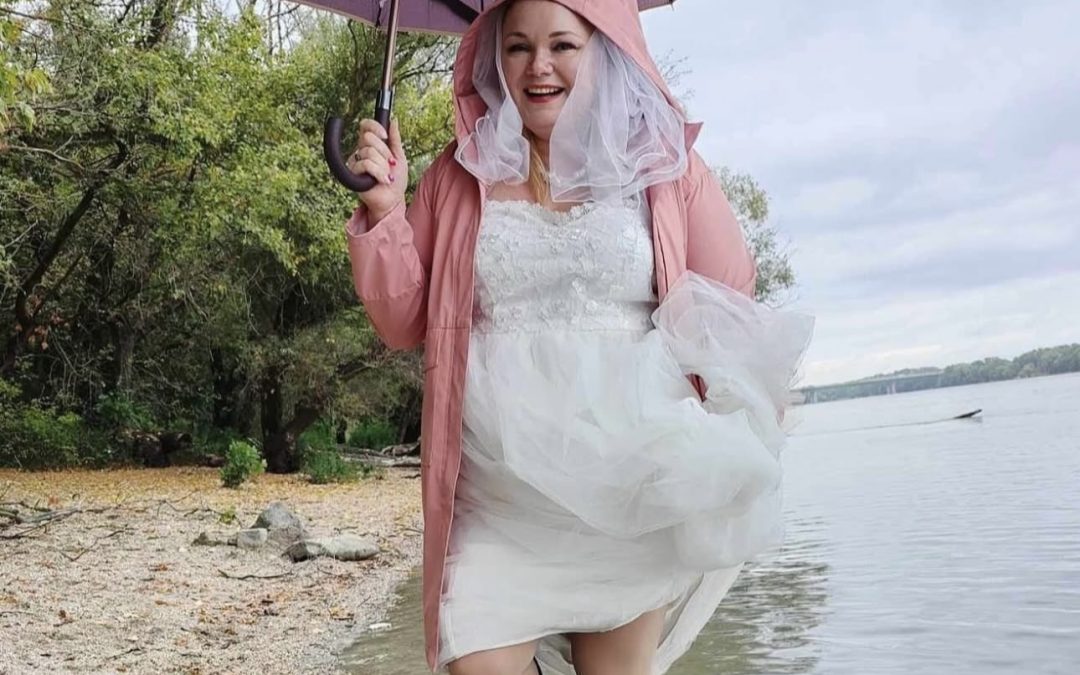 Menyasszonyi ruhát öltött. De mivel a part sárban állt, fekete gumicsizmát húzott hozzá. Rózsaszín esőkabátban, lila esernyővel lépett a vízbe. Nevetett, ugrált, fotózkodott. A szentség és a játékosság ritka találkozása volt ez, felszabadító és mély.